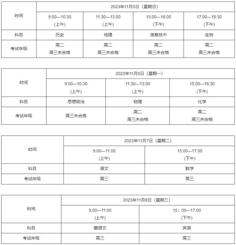 (三)音乐、体育、美术和通用技术考试时间由各地(市)根据实际情况合理安排,但须在2023年11月12日前完成,成绩于11月16日前完成上报。
