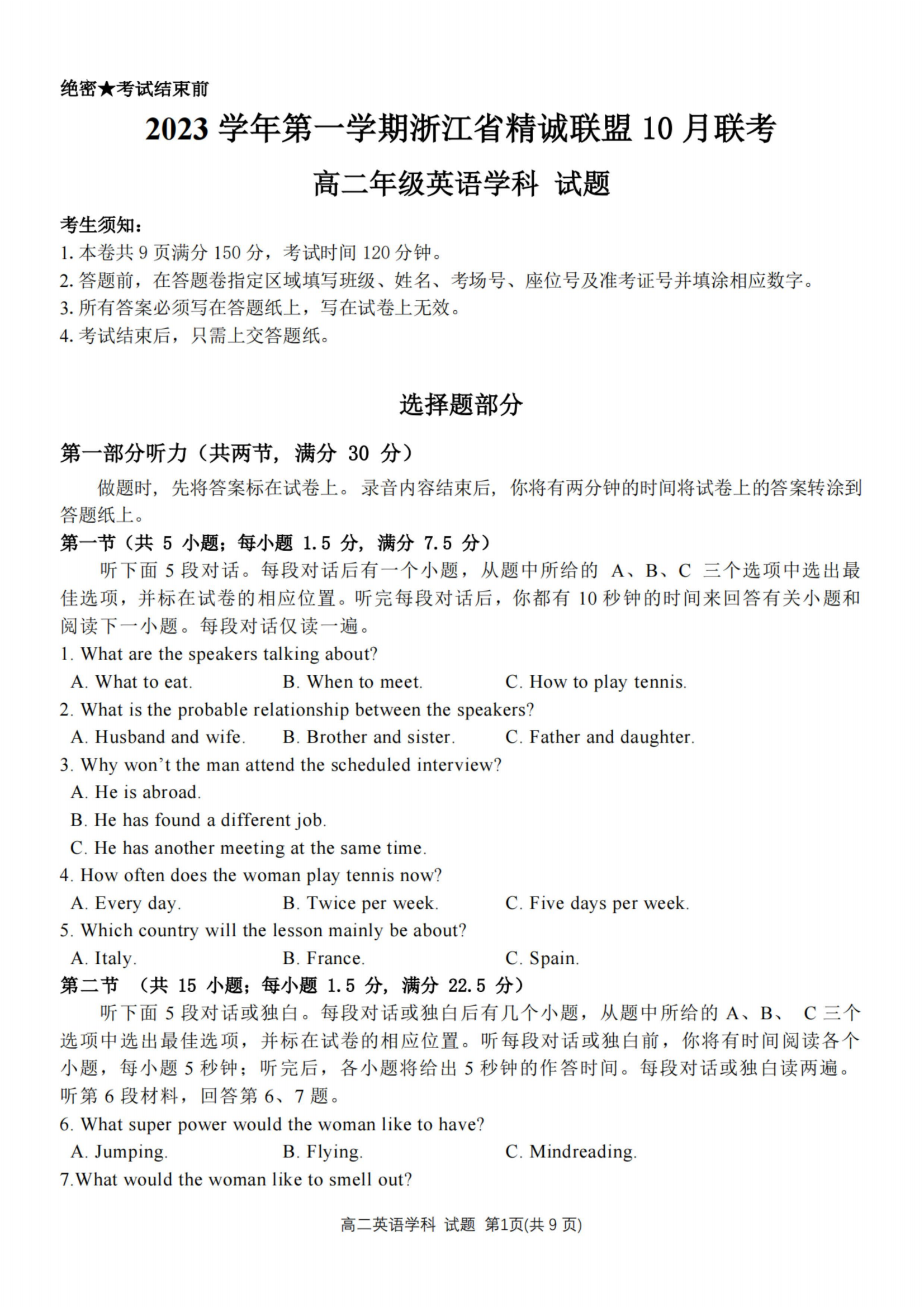 2024届浙江省精诚联盟高二10月联考于近期开考,为方便大家巩固练习,自主选拔在线浙江新高考团队同步整理了2024届浙江省精诚联盟高二10月联考英语试题及答案,供大家下载学习。2024届浙江省精诚联盟高二10月联考于近期开考,为方便大家巩固练习,自主选拔在线浙江新高考团队同步整理了2024届浙江省精诚联盟高二10月联考英语试题及答案,供大家下载学习。