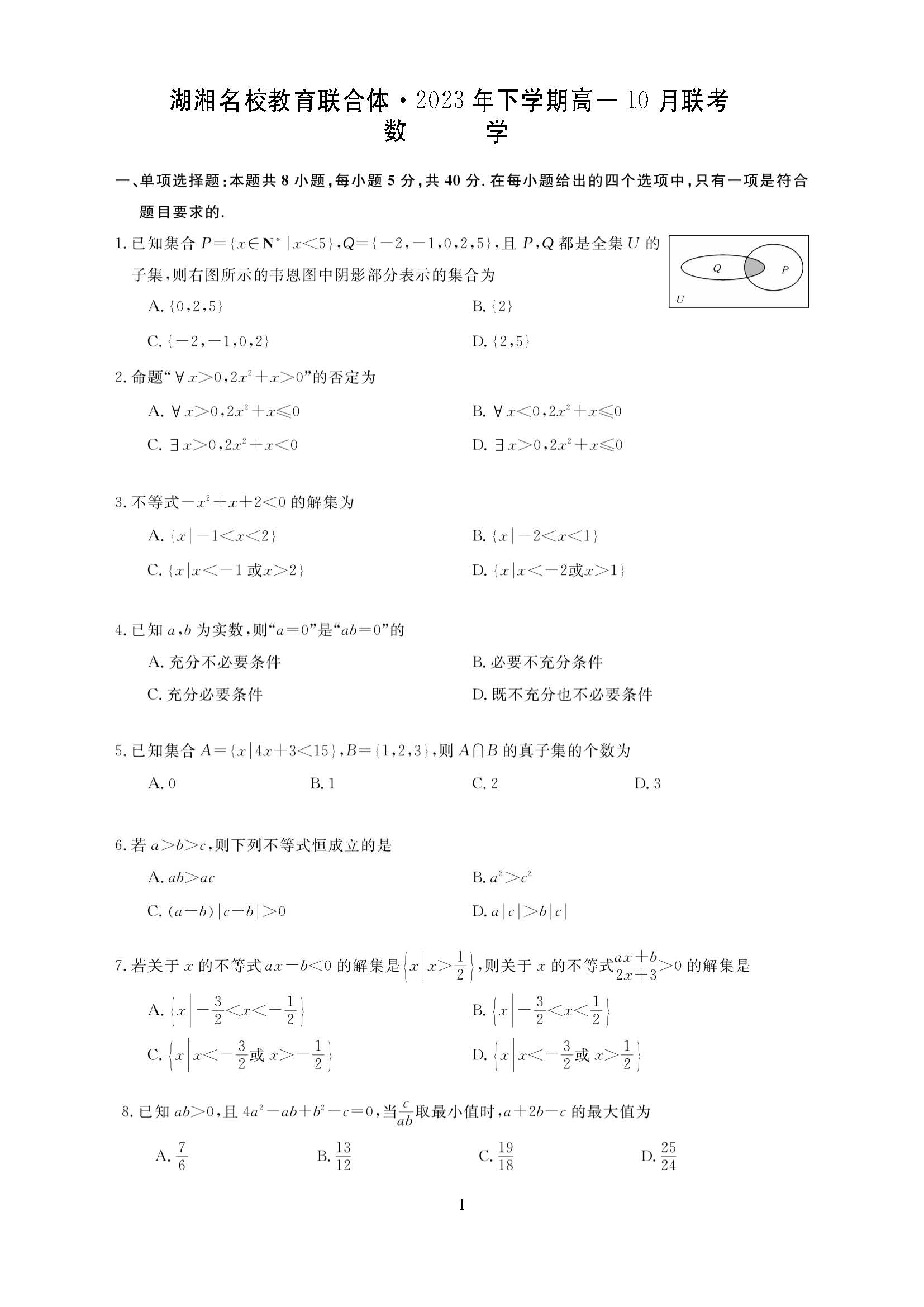 天壹名校联盟湖湘名校联合体2024届高一10月月考数学试题