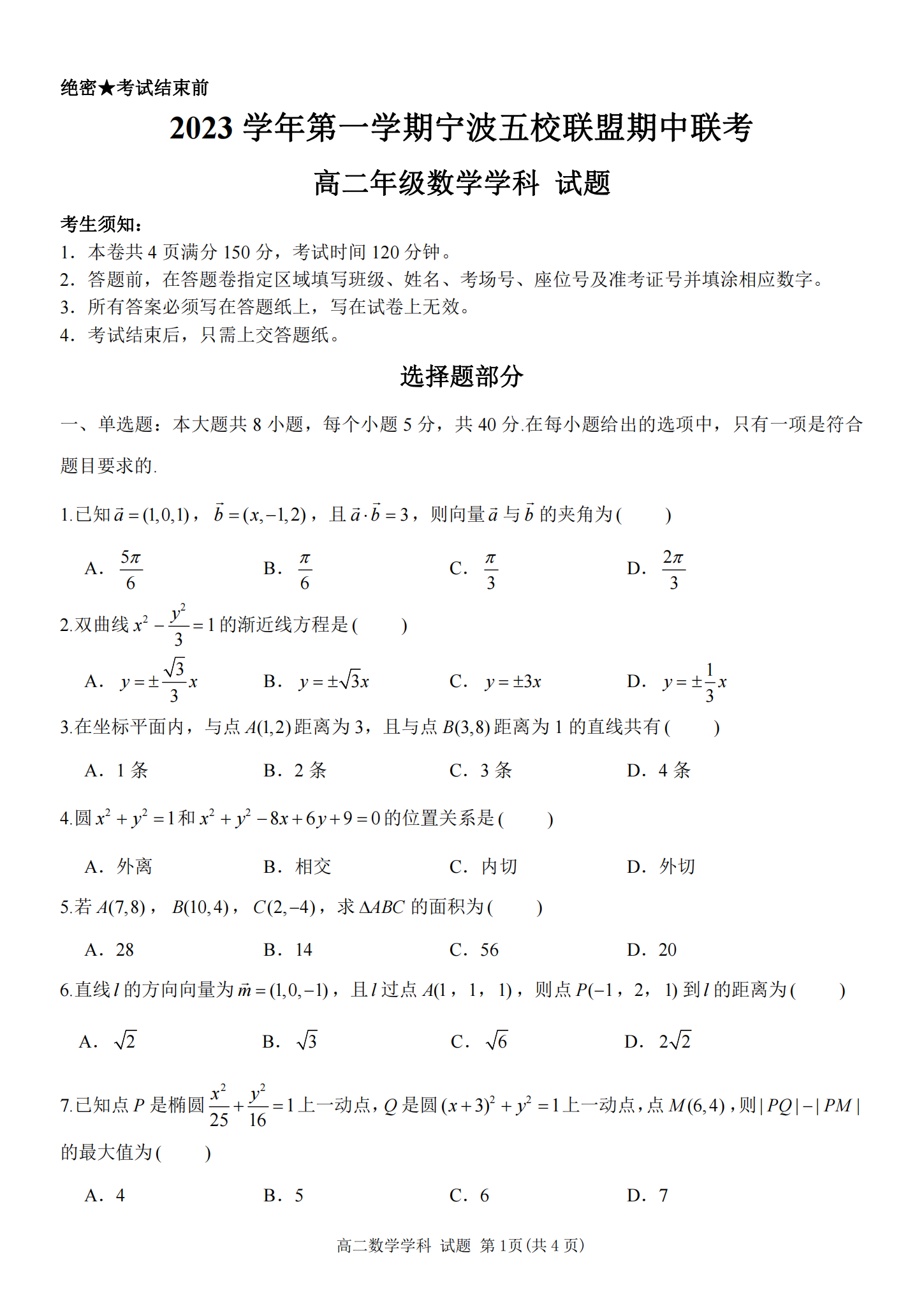 浙江省2023学年11月宁波五校高二期中联考数学试题