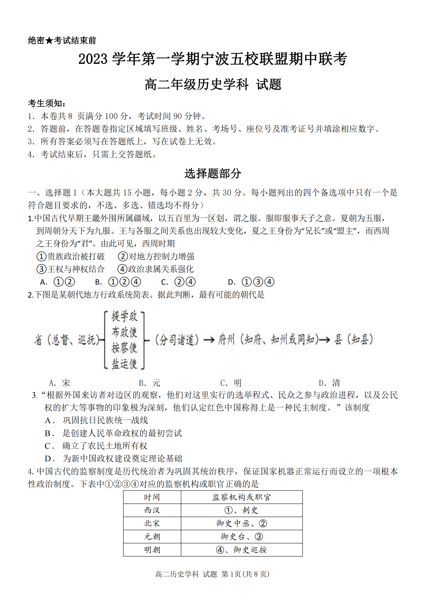 浙江省2023学年11月宁波五校高二期中联考历史试题