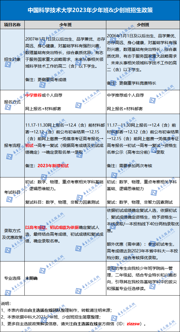 2、招生对象方面,综合优秀各科均衡的考生推荐关注少年班,有学科特长或竞赛奖项的考生推荐关注少创班。