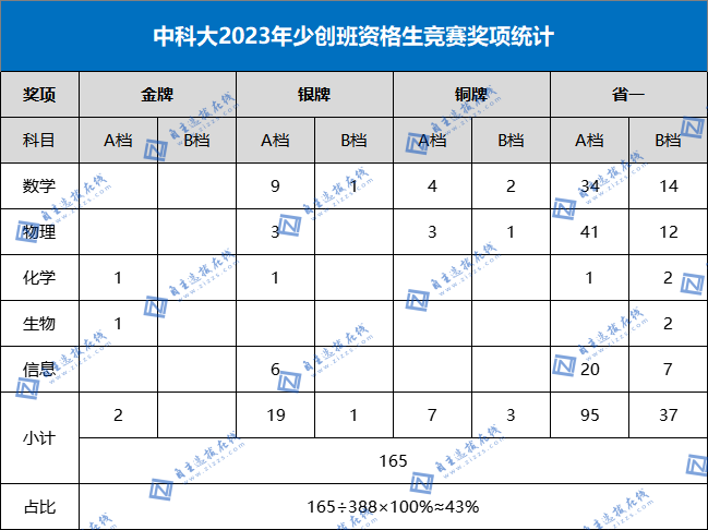 少创班对具备竞赛奖项的考生更优待,考生根据所获奖项不同可获得初试加10分/20分及直接进入复试的优惠。统计少创的生源获奖情况,往年具有省一以上奖项考生占比在43%~55%左右。