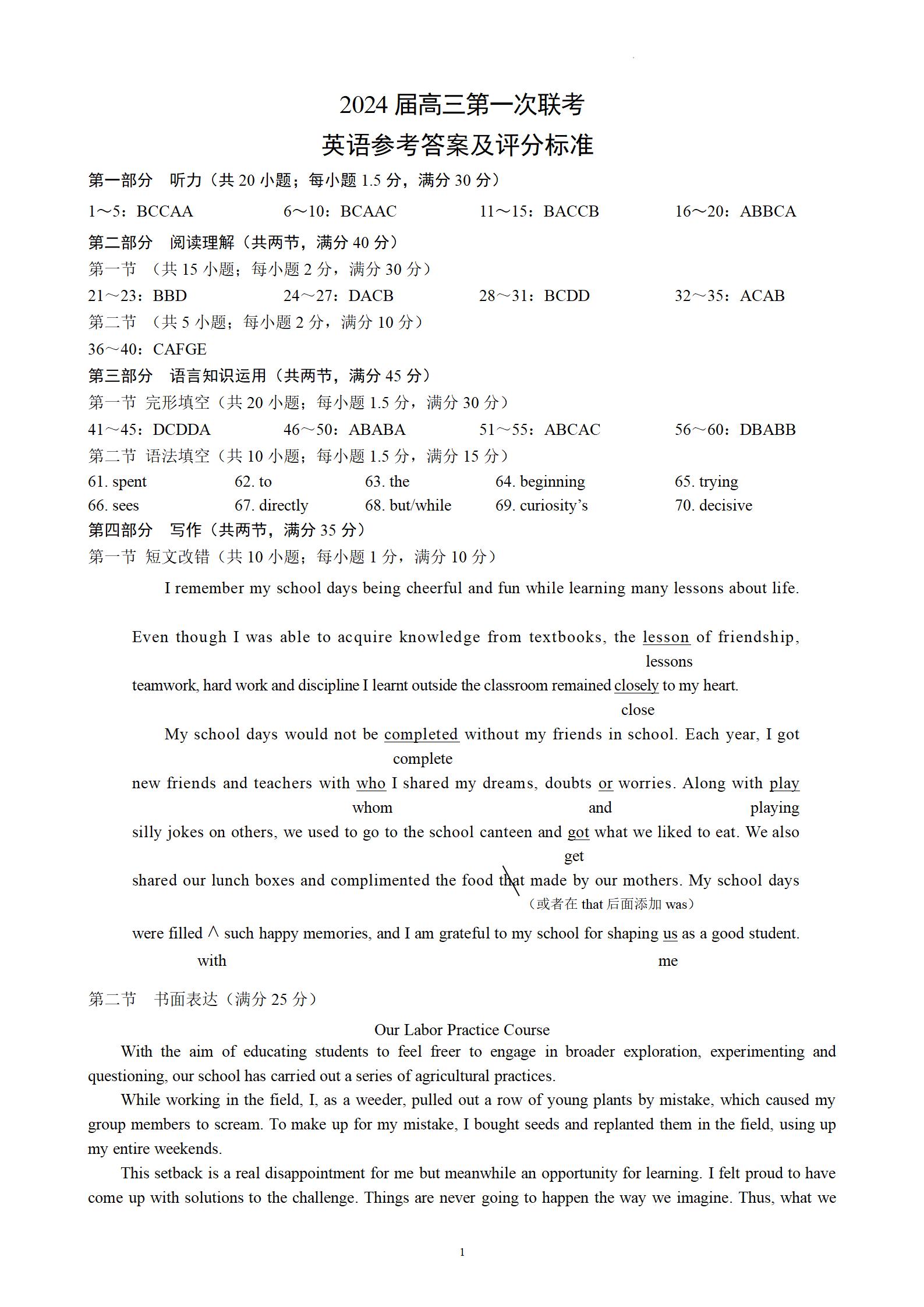 四川省成都市蓉城名校联盟2024届高三上学期第一次联考英语答案