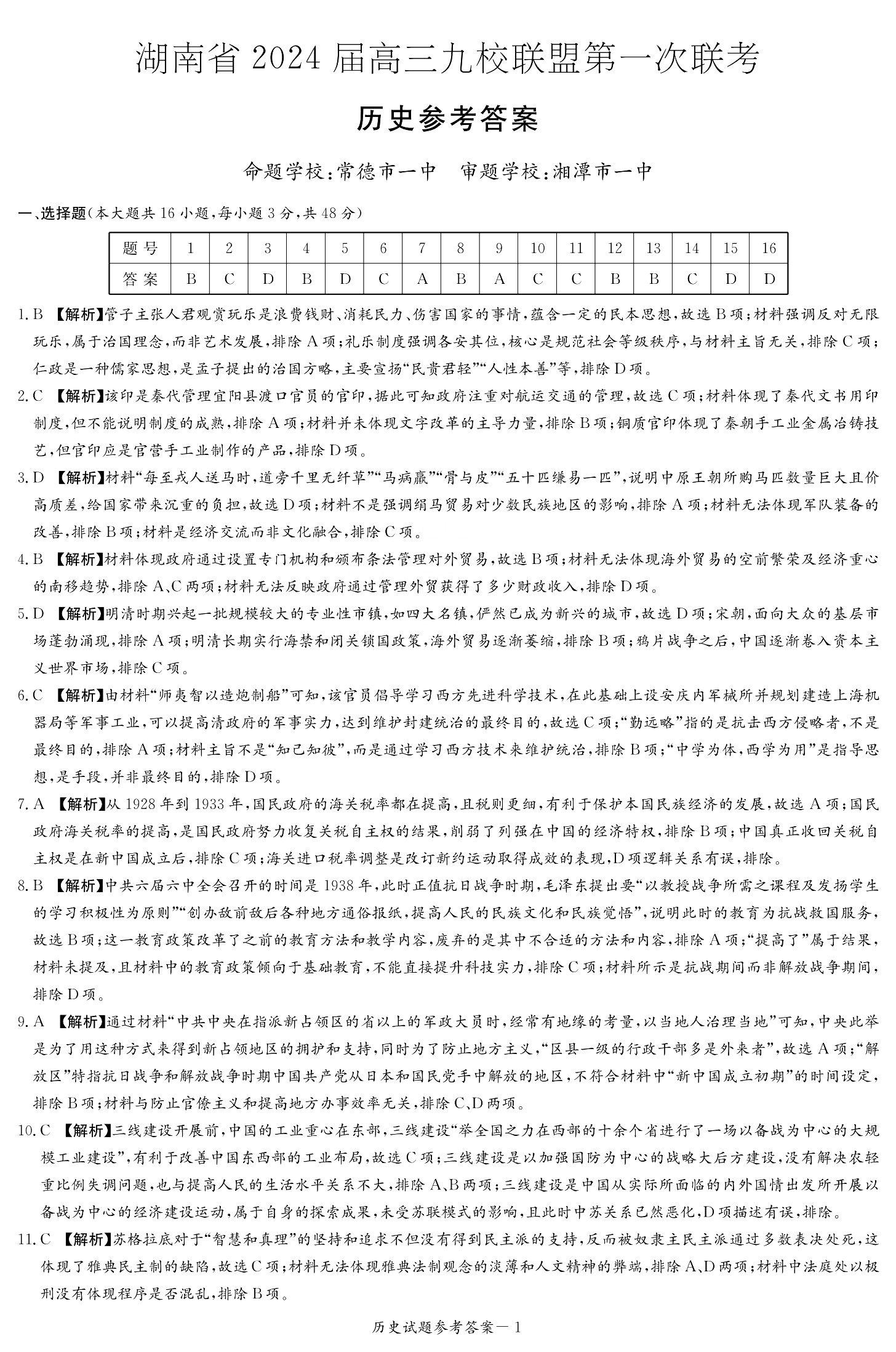 湖南省九校联盟2024届高三12月联考历史试题及答案