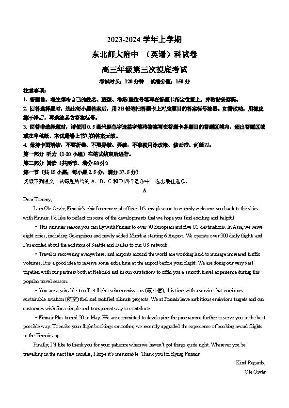 立即下载:吉林省东北师大附中2024届高三上第三次摸底考试英语试题