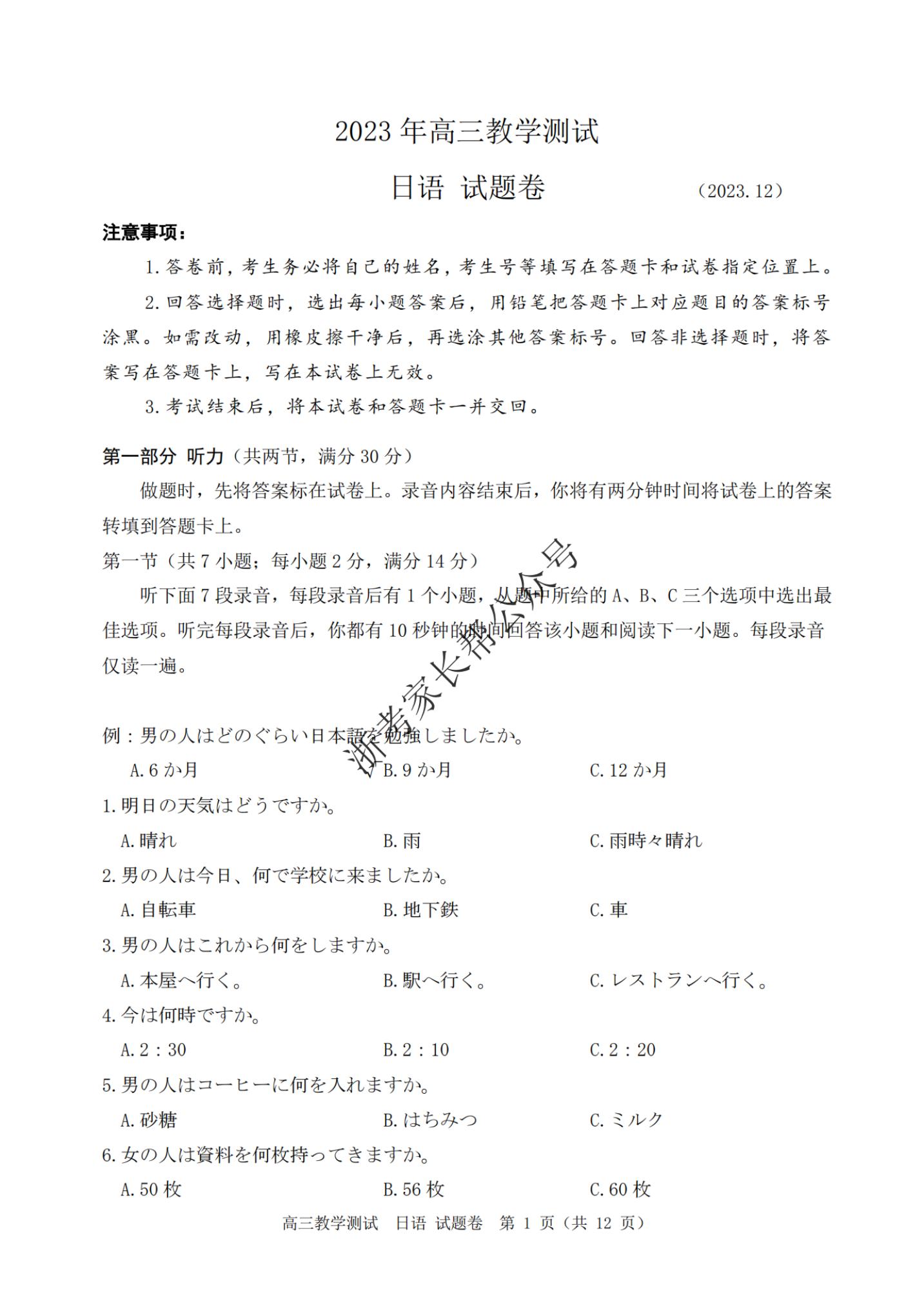 2023年12月浙江嘉兴一模试题及答案无水印PDF版,点击下方链接免费领取!