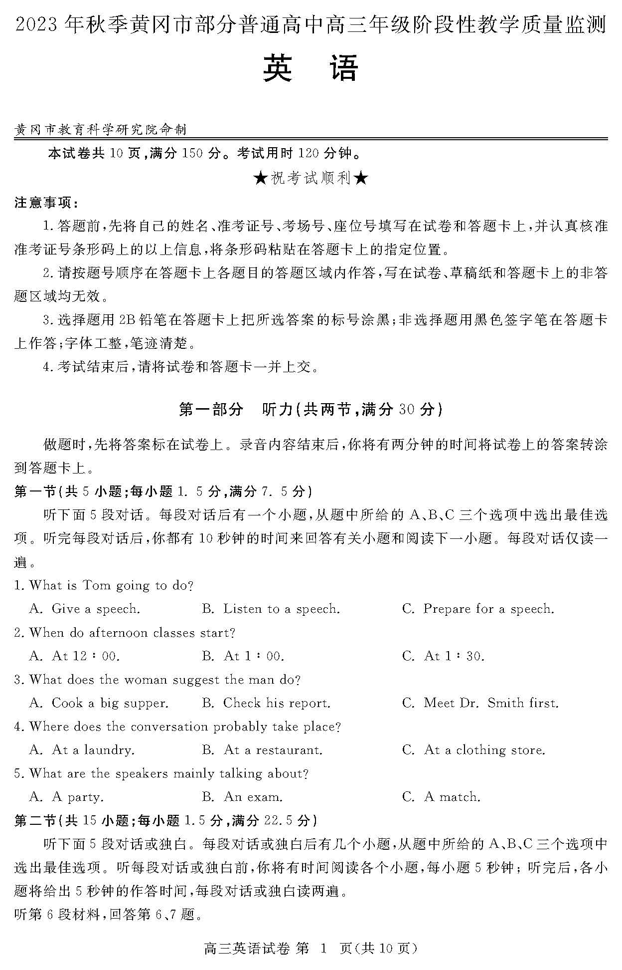 湖北省黄冈市2024届高三期中质量监测英语试题