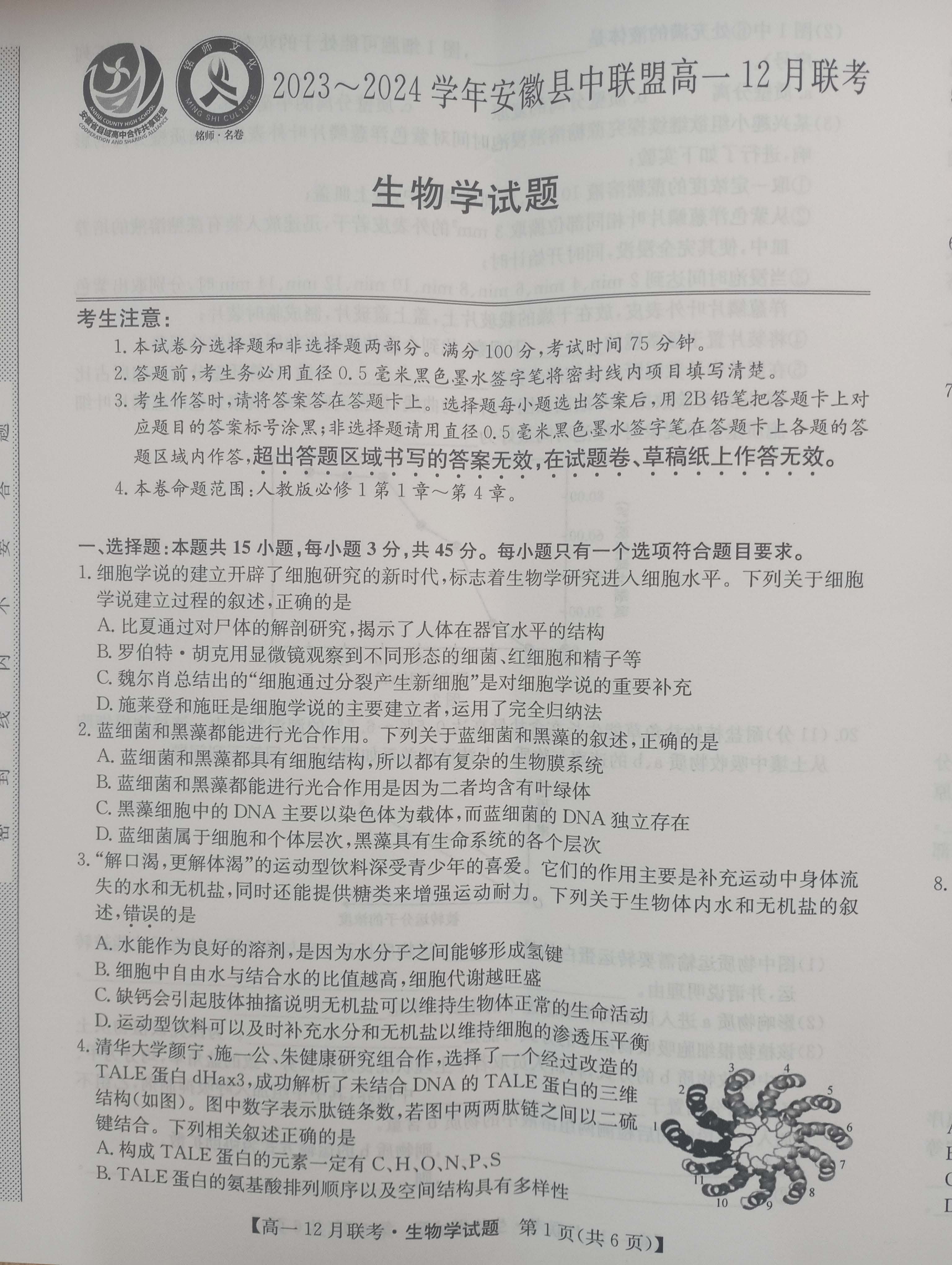 安徽省县中联盟2024学年高一上学期12月月考生物试题