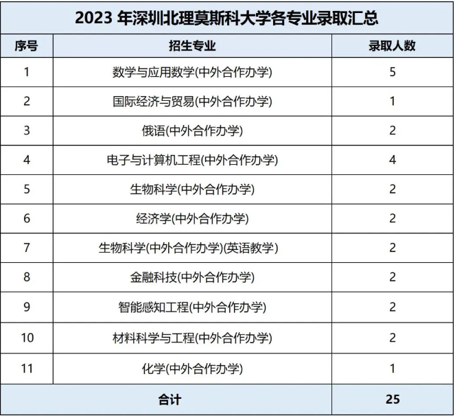 从上述的表格数据我们能够看的出来,2023年深圳北理莫斯科大学各专业在江苏省一共录取25人,而且各个专业的录取名额也是不一样的,其中,数学与应用数学(中外合作办学)5人、国际经济与贸易(中外合作办学)1人、俄语(中外合作办学)2人、电子与计算机工程(中外合作办学)4人、生物科学(中外合作办学)2人、经济学(中外合作办学)2人、生物科学(中外合作办学)(英语教学)2人、金融科技(中外合作办学)2人、智能感知工程(中外合作办学)2人、材料科学与工程(中外合作办学)2人、化学(中外合作办学)1人。