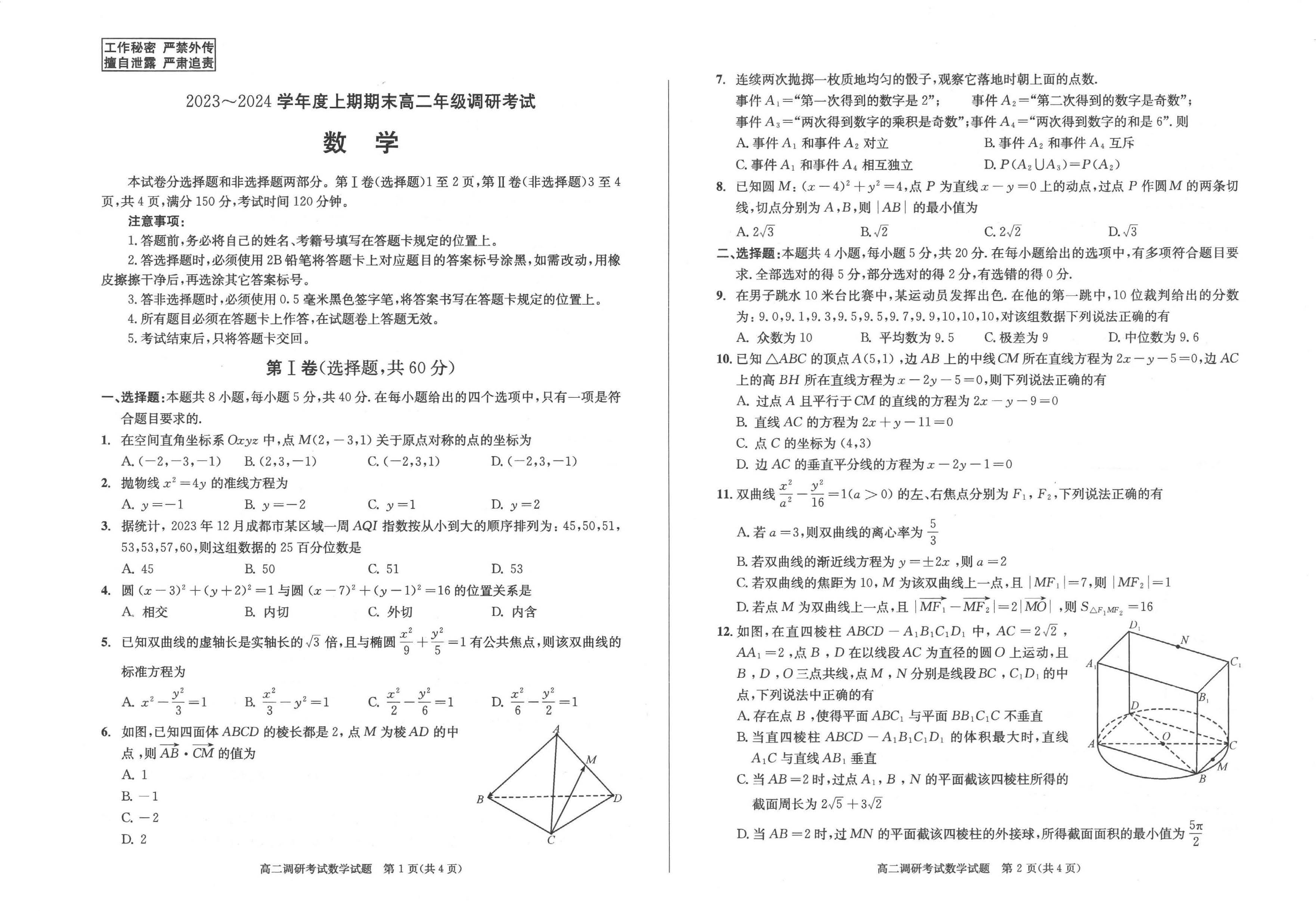 四川省成都市2024学年高二上学期期末调研考试数学试题