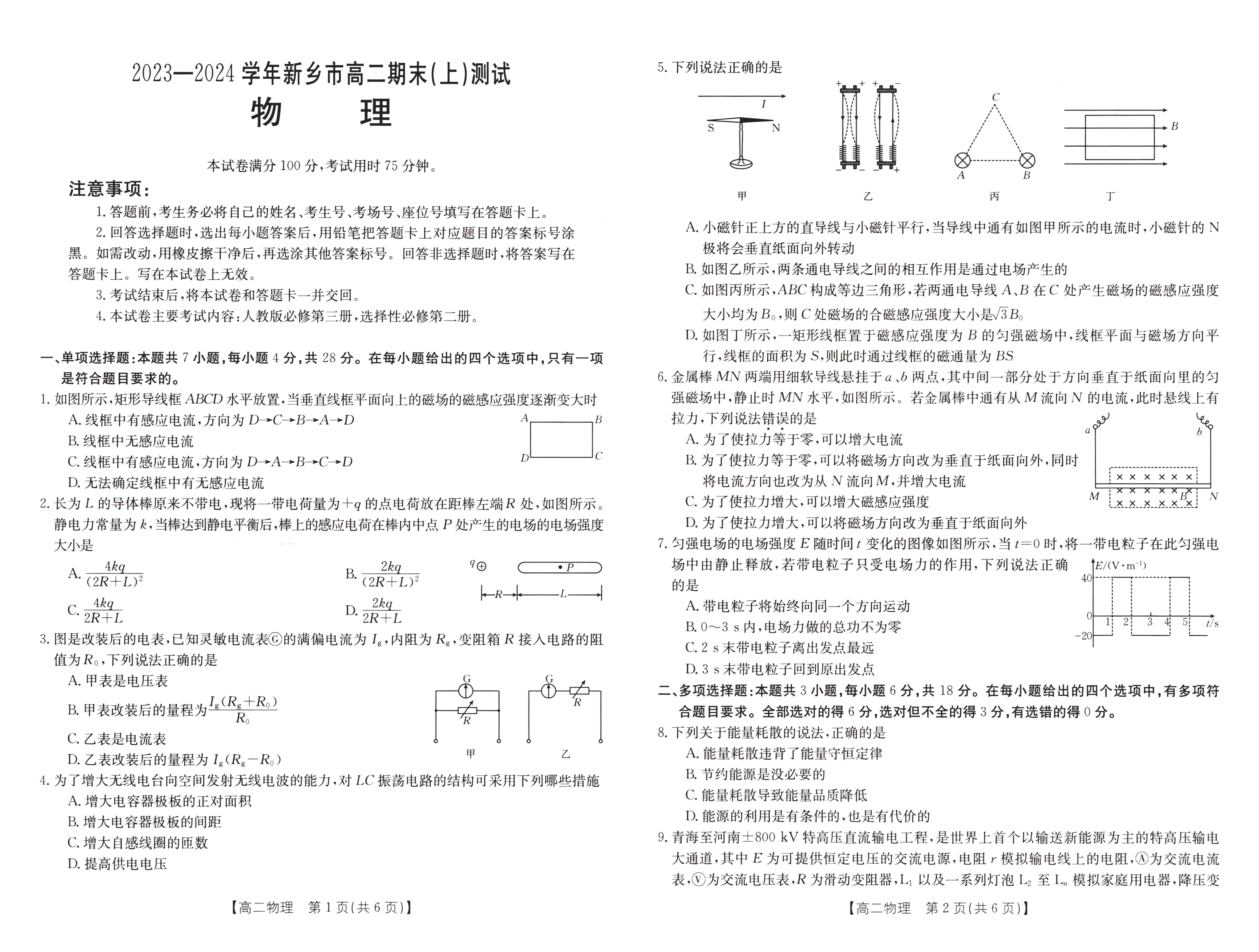 河南省新乡市2024学年高二上学期1月期末物理试题