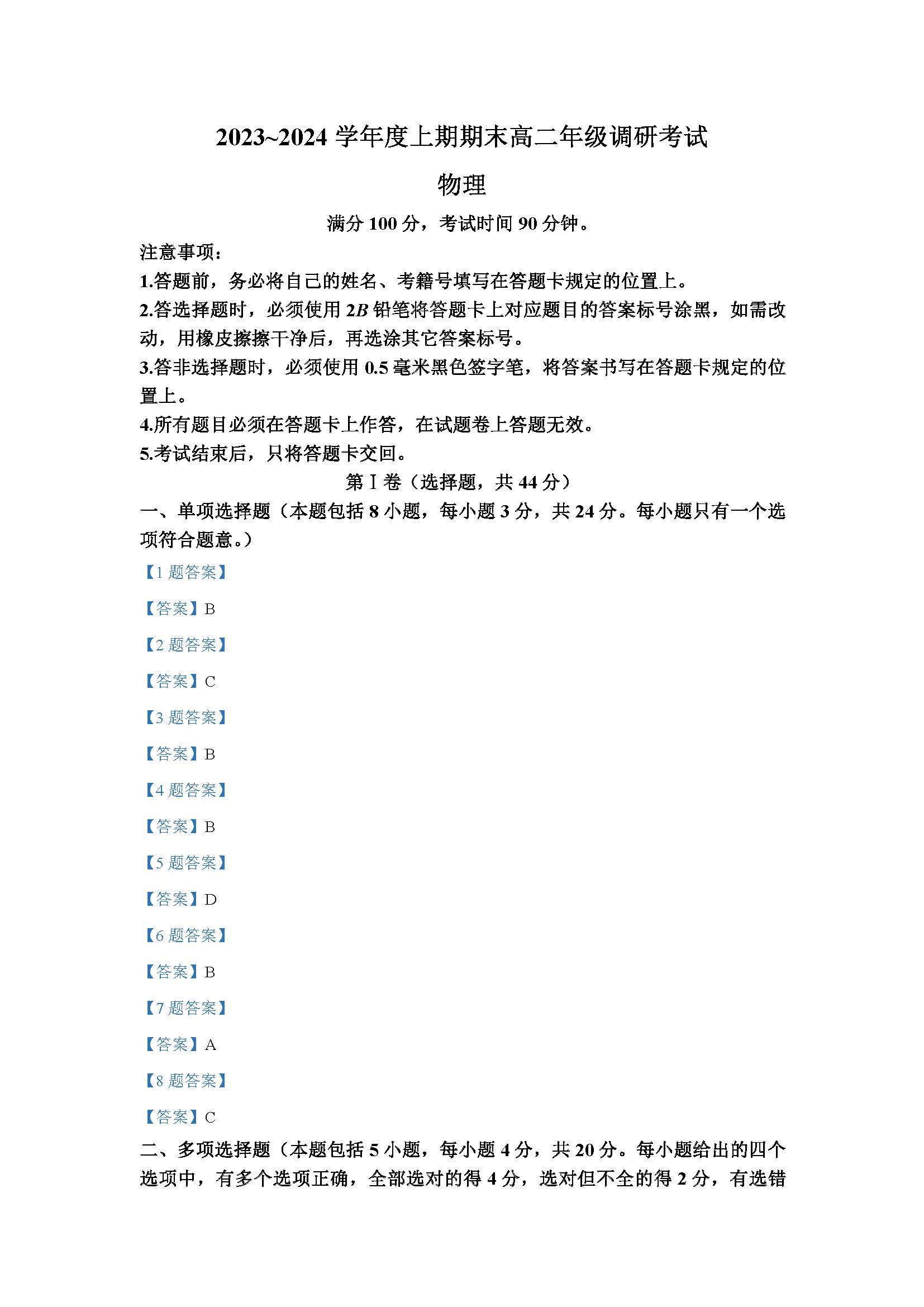 四川省成都市2024学年高二上学期期末调研考试物理答案