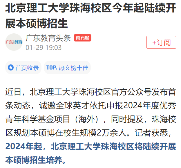 据南方日报1月29日消息,2024年起北京理工大学珠海校区将陆续开展本硕博招生培养。