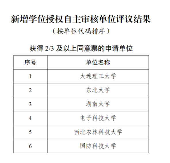 日前,国务院学位委员会办公室公示新增博士硕士学位授权审核专家核查及评议结果。其中,大连理工大学、东北大学、湖南大学、电子科技大学、西北农林科技大学和国防科技大学,6所高校拟获批新增学位授权自主审核单位。至此,自主审核单位的数量达到38所。