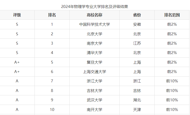 物理学专业开设院校有290所,从榜单中我们可以看出,TOP4的院校分别是中国科学技术大学、北京大学、南京大学和清华大学,评级均为S,全国排名前2%,同样位于全国前2%的学校还有复旦大学和上海交通大学,这两所学校评级为A+。另外,进入全国前10%的高校共有29所,评为A级的院校共有23所,B类及以上院校145所。