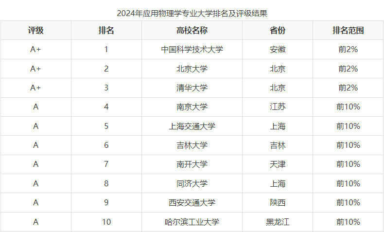 应用物理学专业有169所院校开设,在全国应用物理专业排名前十的院校中,中国科学技术大学、北京大学和清华大学位列前三,评级结果为A+,进入全国前10%的高校共有17所,评级为B+的院校共有25所。