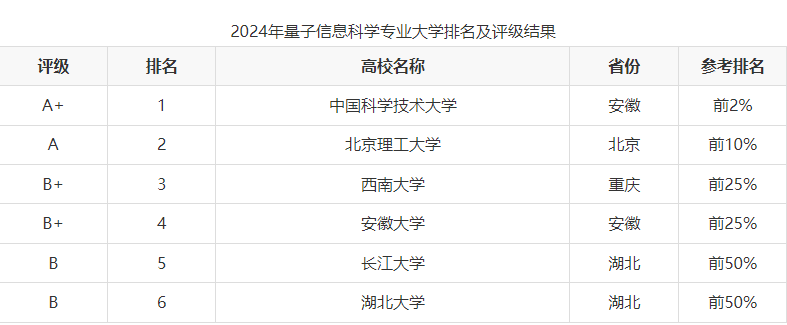量子信息科学专业有8所高校开设,B类及以上院校6所,中国科学技术大学位列第一,评级结果为A+;北京理工大学评级结果为A,西南大学和安徽大学评级结果为B+。