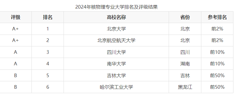 核物理专业共有7所高校开设,其中B类及以上院校共有6所,北京大学、北京航空航天大学两所院校位列第一第二且评级都为A+,都位于全国前2%,四川大学、南华大学进入全国排名前10%,评级结果为A。