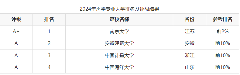 共有4所高校开设声学专业,均为B类及以上学校,南京大学排名第一,评级为A+。