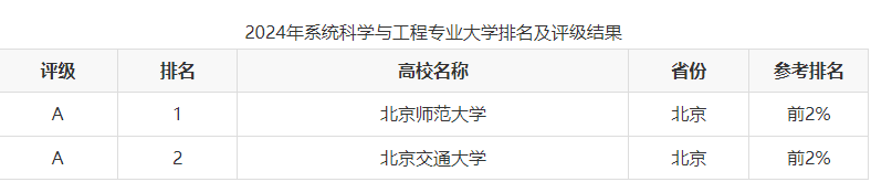 系统科学与工程专业有4所院校开设,北京师范大学、北京交通大学位列第一第二,评级为A。