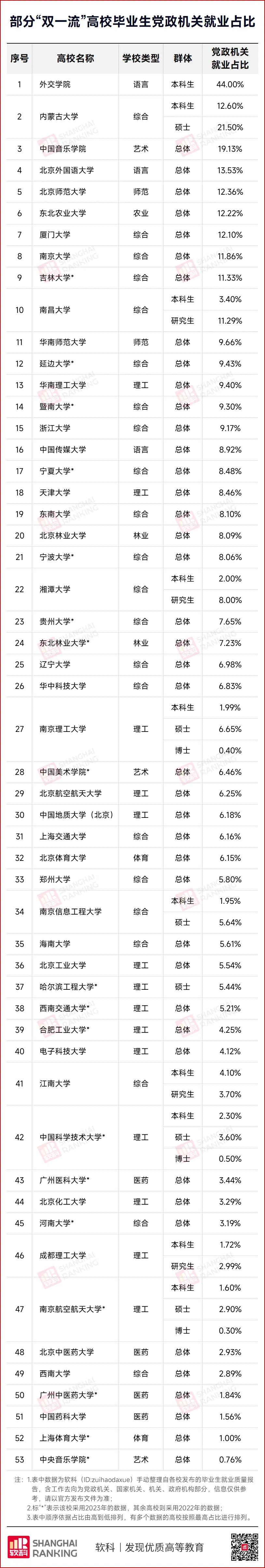 中国音乐学院、北京外国语大学、北京师范大学、东北农业大学、厦门大学、南京大学、吉林大学整体毕业生就职党政机关的比例均超10%。内蒙古大学按照培养层次分别统计,本科生与硕士在党政机关就职的比例都超过了10%,南昌大学研究生的比例同样大于10%。