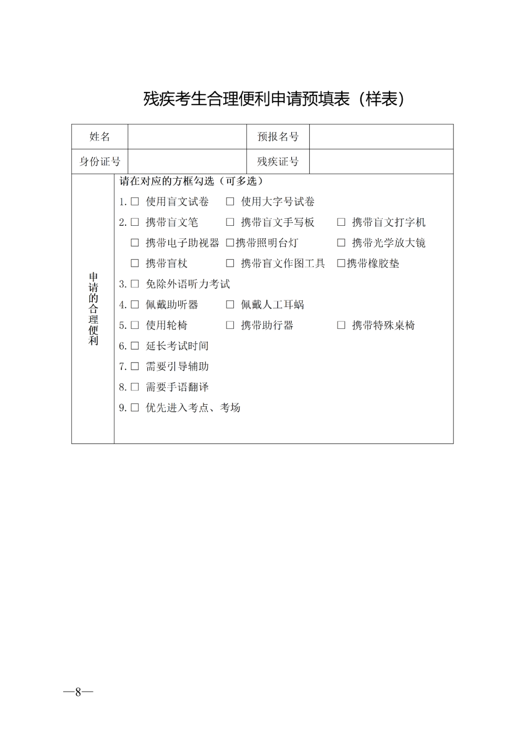 9.残疾考生参加高考可申请合理便利,报名同时即进行申报。有关办法按照《安徽省教育厅 安徽省残疾人联合会关于印发<安徽省残疾人参加普通高校招生考试申请合理便利实施细则>的通知》(皖教办〔2018〕6号)执行。残疾考生报名流程同其他考生,除提供报名必须的身份证、户口簿等材料外,还须提供第二代残疾证,并在信息网上填报时录入残疾证号码。其中申请残疾考生参加高考合理便利的考生在报名时须同时在网上申报,《残疾考生合理便利申请预填表》(见附件5)。残疾考生合理便利申请及相关证明材料在体检结束、各部门会商完毕后由各级教育招生考试机构通过报名管理后台拍摄上传。