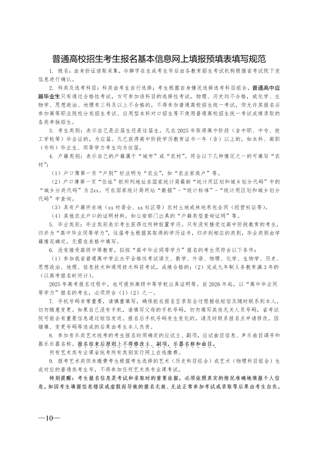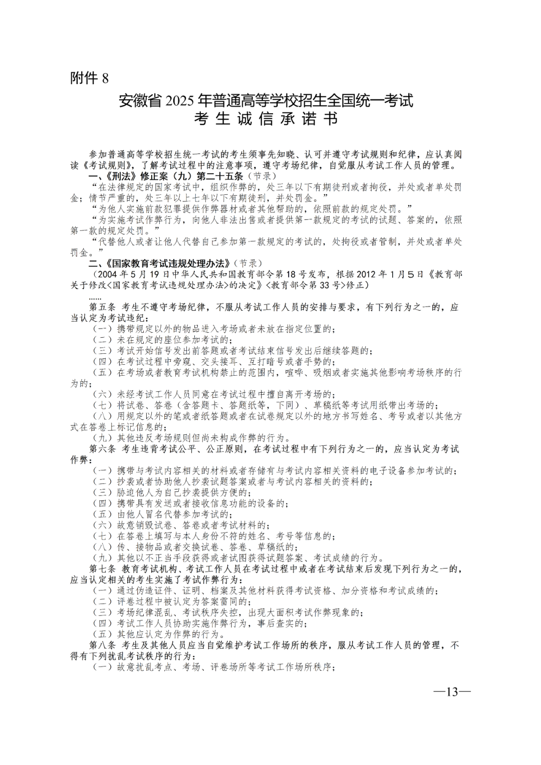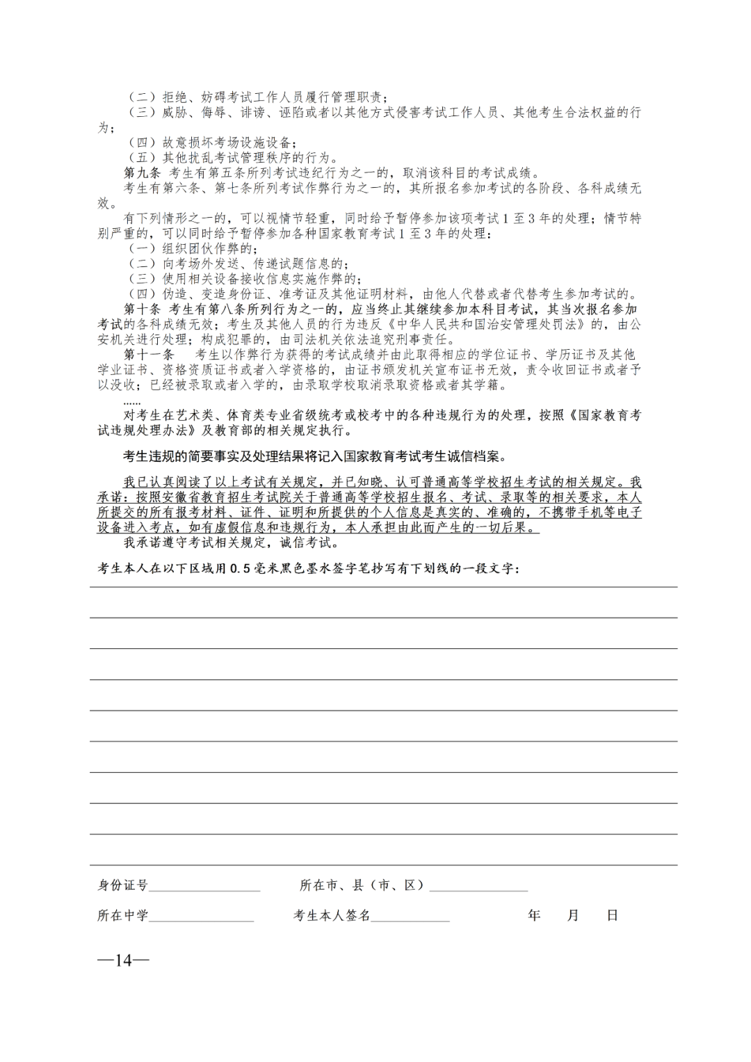 10.考生报名时须仔细阅读并签署《安徽省2025年普通高等学校招生全国统一考试考生诚信承诺书》,交由各区县教育招生考试机构留存。
