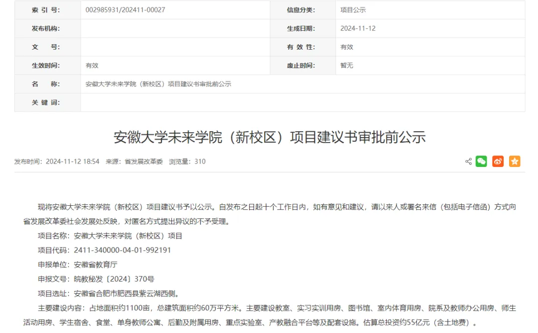 11月12日,安徽省发展和改革委员会发布了《安徽大学未来学院(新校区)项目建议书审批前公示》:现将安徽大学未来学院(新校区)项目建议书予以公示。项目选址为安徽省合肥市肥西县紫云湖西侧。建设占地面积约1100亩,总建筑面积约60万平方米,估算总投资约55亿元(含土地费)。