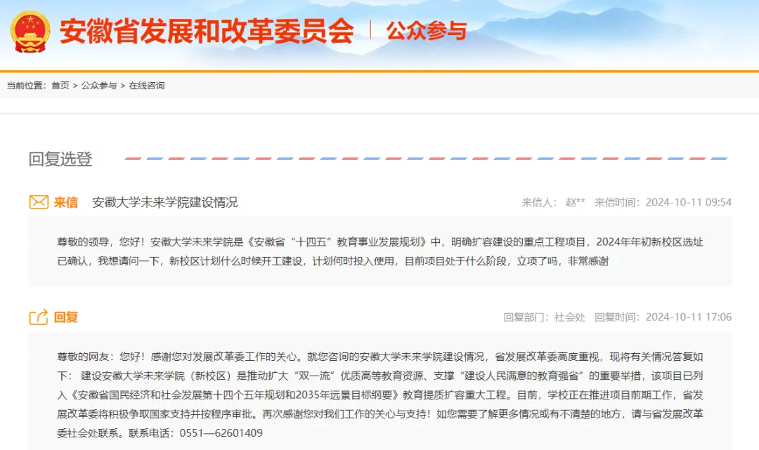 10月11日,针对网友对安徽大学未来学院建设情况的咨询,安徽省发展改革委社会处回复称:建设安徽大学未来学院(新校区)是推动扩大“双一流”优质高等教育资源、支撑“建设人民满意的教育强省”的重要举措,该项目已列入《安徽省国民经济和社会发展第十四个五年规划和2035年远景目标纲要》教育提质扩容重大工程。目前,学校正在推进项目前期工作,省发展改革委将积极争取国家支持并按程序审批。