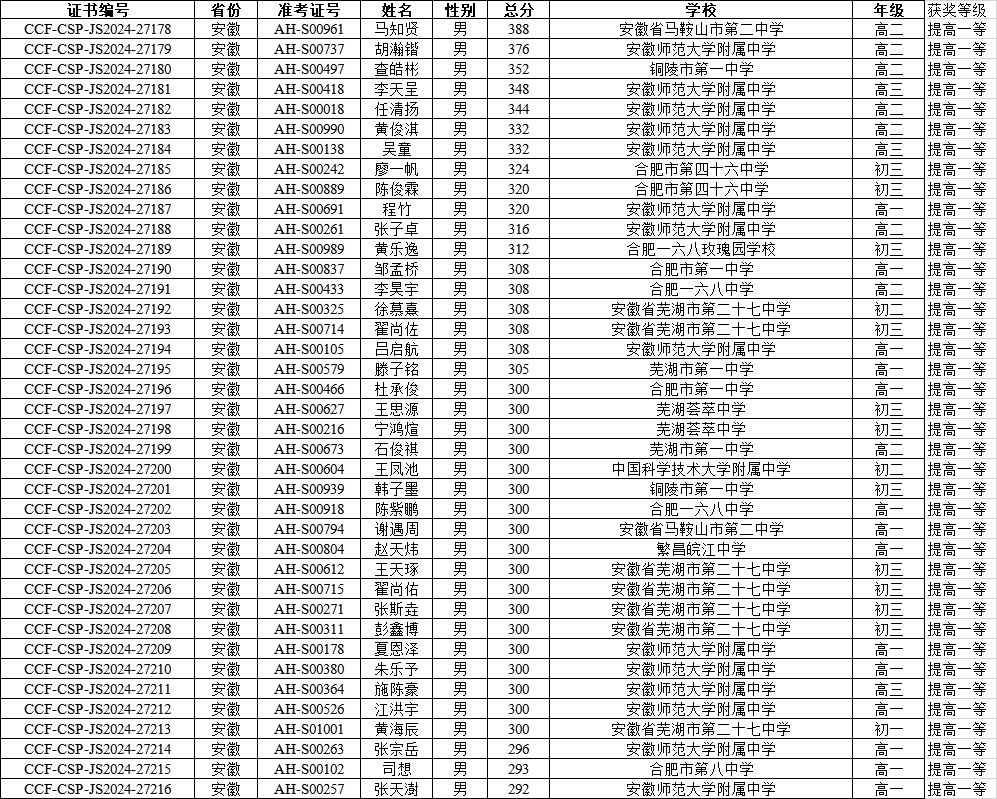 完整名单下载:安徽省CCF CSP-J/S2024第二轮提高级一等二等三等名单.xlsx