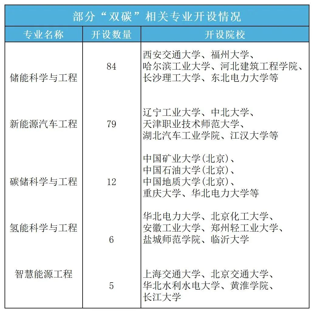 2022年,教育部在答复《关于建立健全碳中和教育相关一流课程与教材体系的提案》中表示,近年来,教育部新批准设置储能科学与工程、新能源汽车与工程、碳储科学与工程、氢能科学与工程、智慧能源工程等10余个本科专业,进一步加大了双碳相关专业人才培养力度。