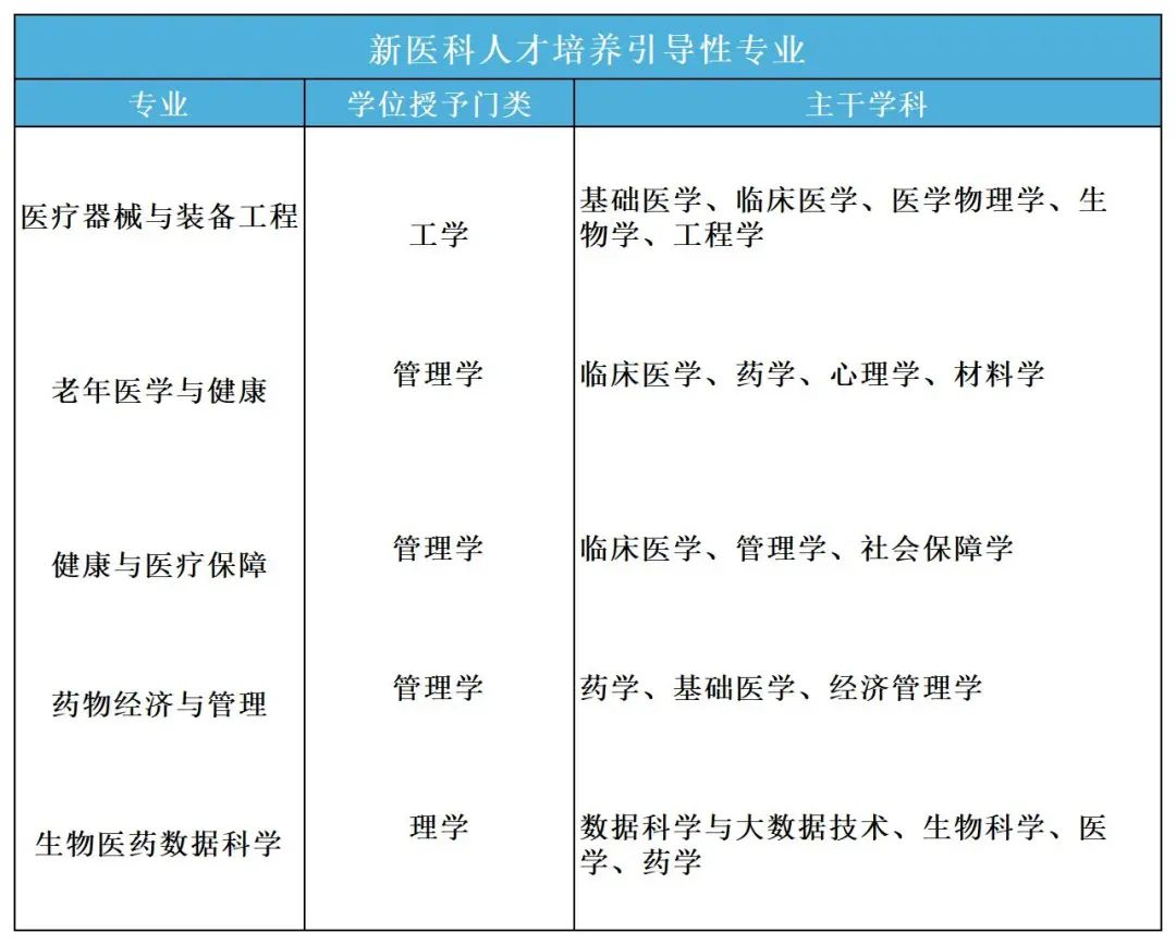 针对医学人才缺口突出的问题,教育部在2023年发布《服务健康事业和健康产业人才培养引导性专业指南》,对接国家重大需求,服务健康事业和健康产业发展新态势,设置5个新医科人才培养引导性专业,分别是医疗器械与装备工程、老年医学与健康、健康与医疗保障、药物经济与管理、生物医药数据科学。