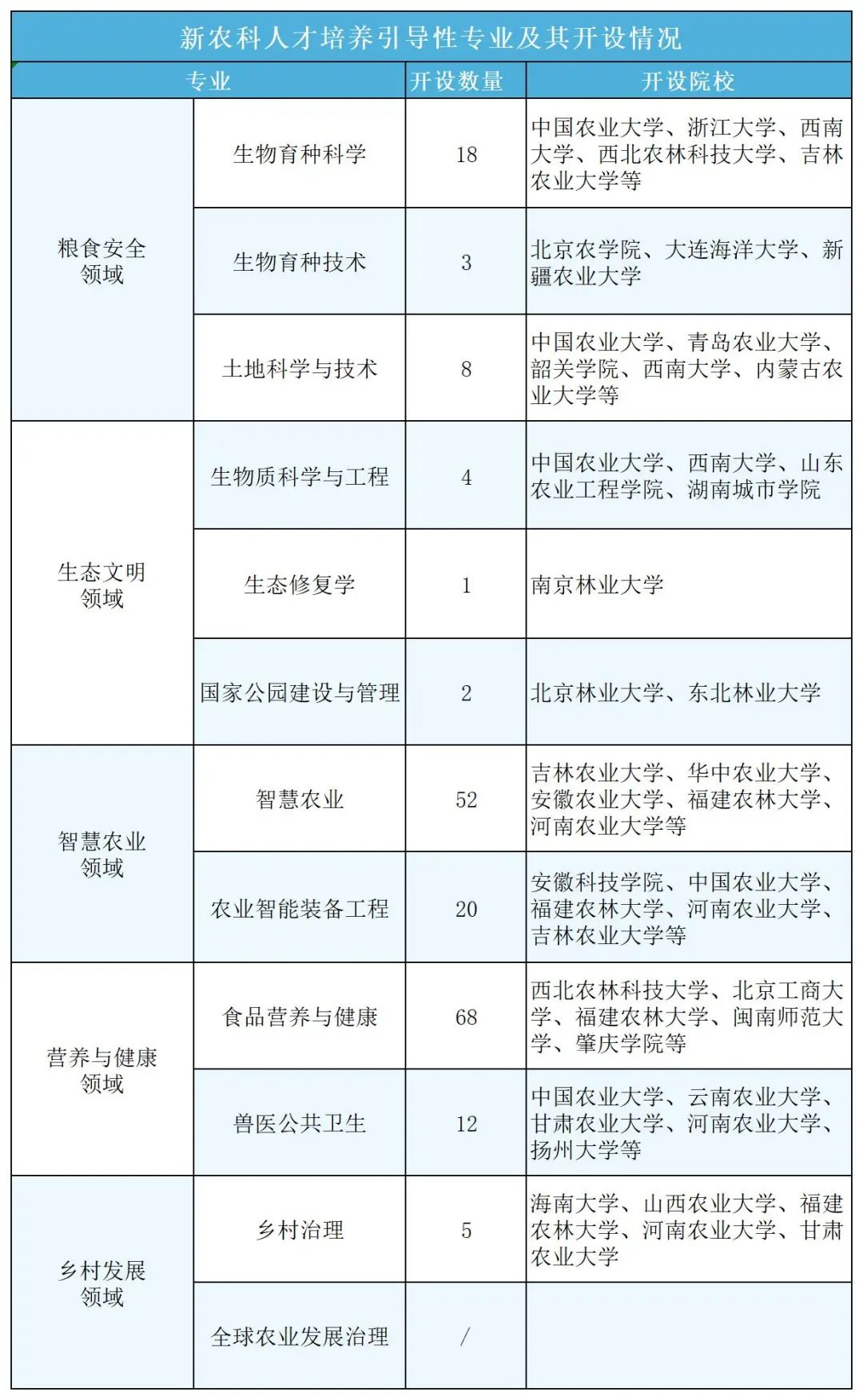 2022年教育部印发《新农科人才培养引导性专业指南》,面向粮食安全、生态文明、智慧农业、营养与健康、乡村发展等五大领域,设置生物育种科学等12个新农科人才培养引导性专业,学位授予门类包含农学、工学、管理学等。