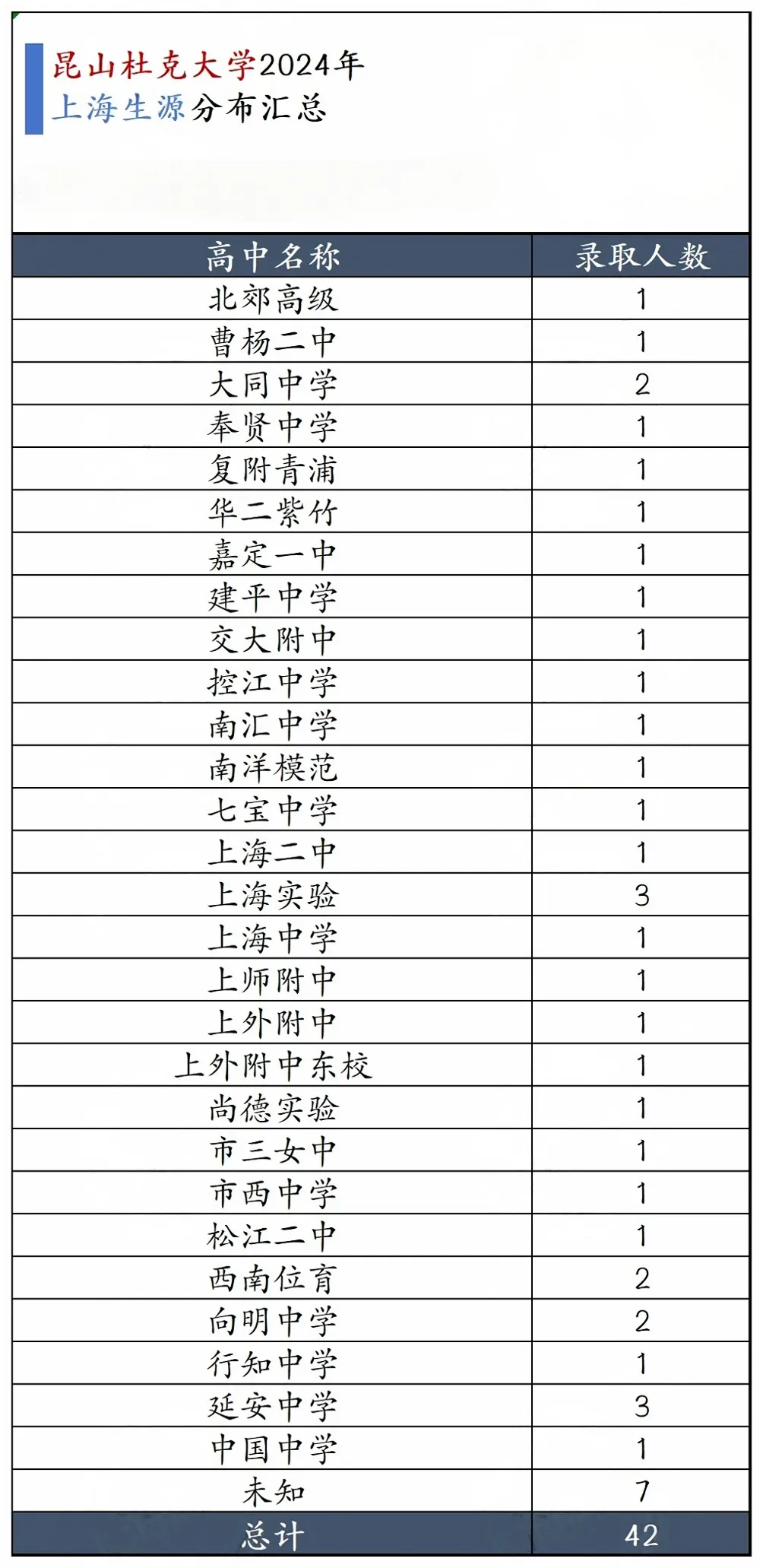 昆山杜克大学2024年在上海招生计划42人,最终录取42人。