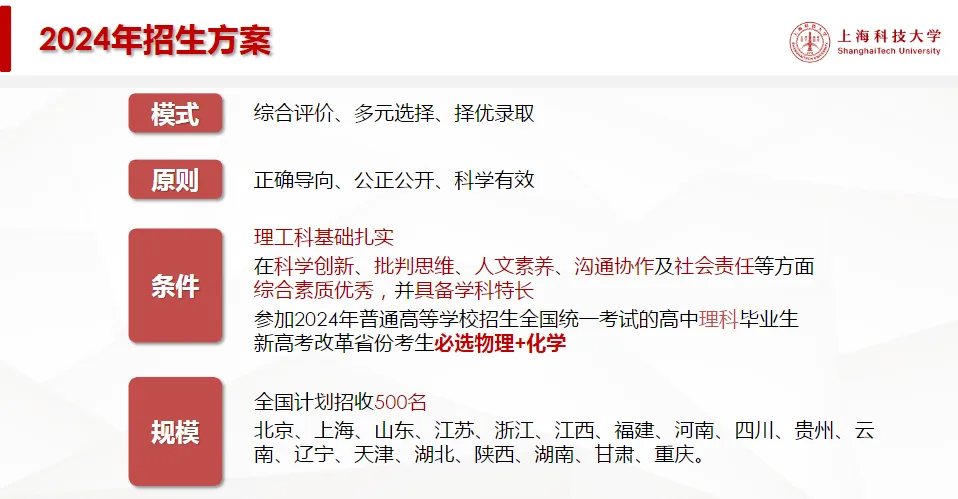 上海科技大学面向18个省市招收500名理科类(新高考必选物理+化学)考生。
