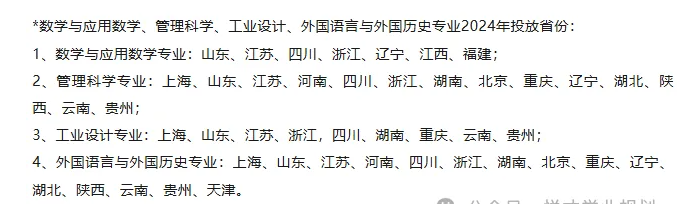 学校2024年拟按照物理学、化学、材料科学与工程、生物科学、生物技术、生物医学工程、电子信息工程、计算机科学与技术、数学与应用数学、管理科学、工业设计、外国语言与外国历史共12个本科专业招录学生。其中,数学与应用数学、管理科学、工业设计、外国语言与外国历史专业仅在部分省(市)招录。学校在高考录取阶段满足被录取考生的第一专业志愿,入学后为符合条件的学生提供公开公正的再次选择专业的机会。