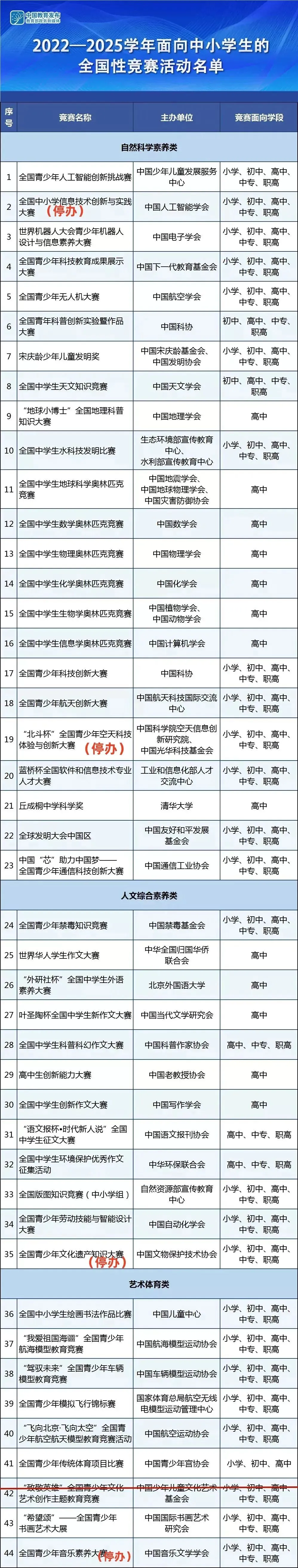 以上仅列举了热门文科赛事名单,以下是教育部公布的2022-2025学年面向中小学生的全国性竞赛活动完整名单。