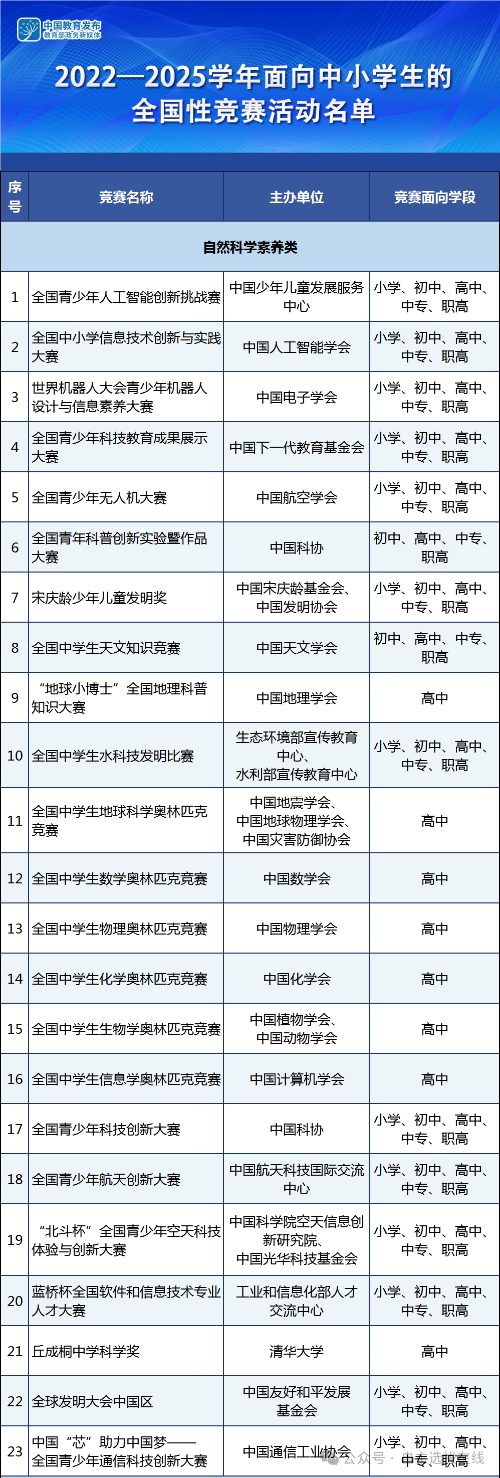 下图汇总整理了教育部公布的2022-2025学年面向中小学生的全国性理科竞赛活动名单,实际情况仍要以各大高校综合评价招生简章为准。考生家长可以看一下你有没有相对应的白名单赛事经历。