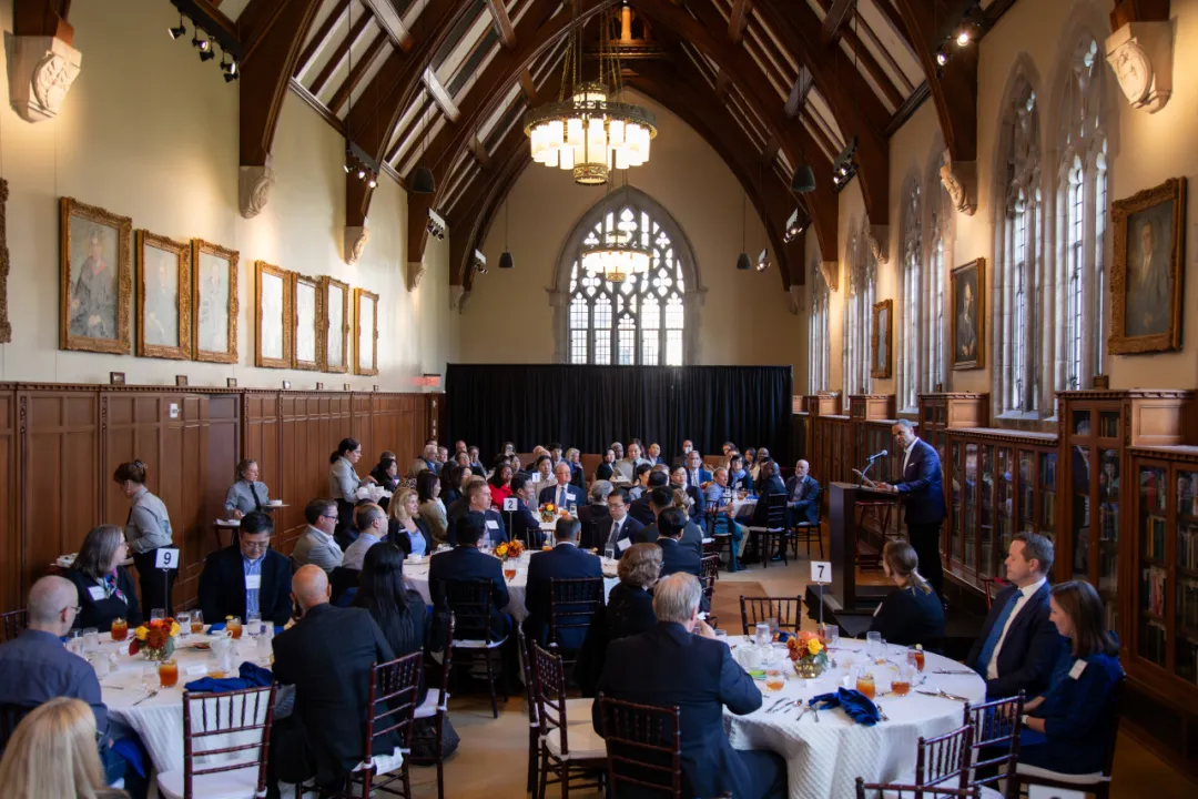 杜克大学教务长加里莫尔在昆杜理事会议午餐会上发言