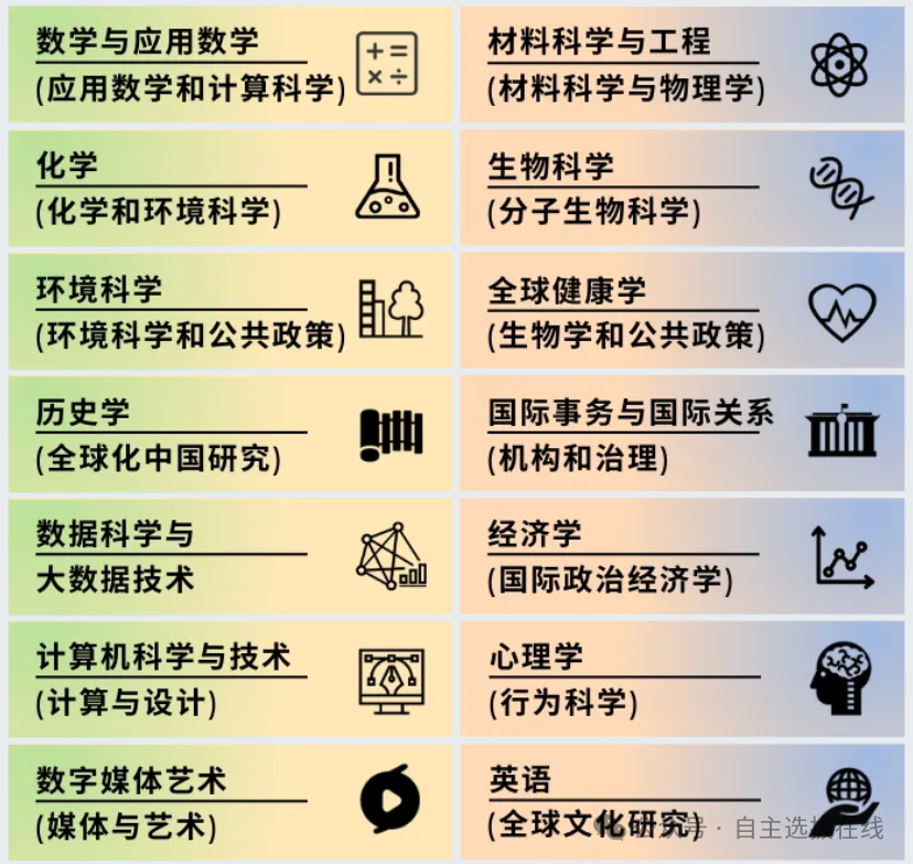 目前学校开设的本科专业包括:金融学(商学与金融、商学与市场营销)、经济学、生物科学、神经科学、物理学、化学、计算机科学与技术(计算机科学、计算机工程)、电子信息工程(电子工程)、数字媒体技术(互动媒体艺术、互动媒体与商学)、数学与应用数学(数学、荣誉数学)、数据科学与大数据技术、世界史(全球中国学、社会科学、综合人文)、自主设计专业方向。