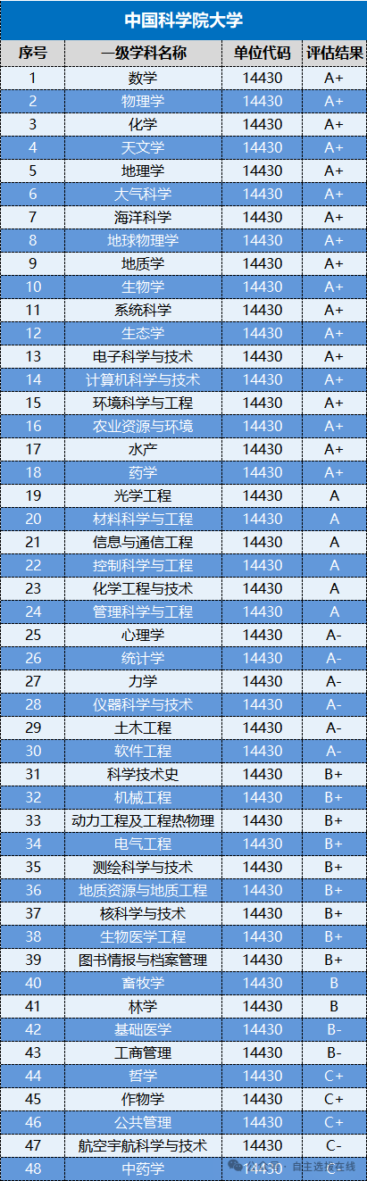 根据全国第四轮学科评估结果,国科大30个学科被评为A类,其中A+学科18个。在ESI(Essential Science Indicators)最新数据中,国科大连续多年霸榜,位列内地高校第一位。