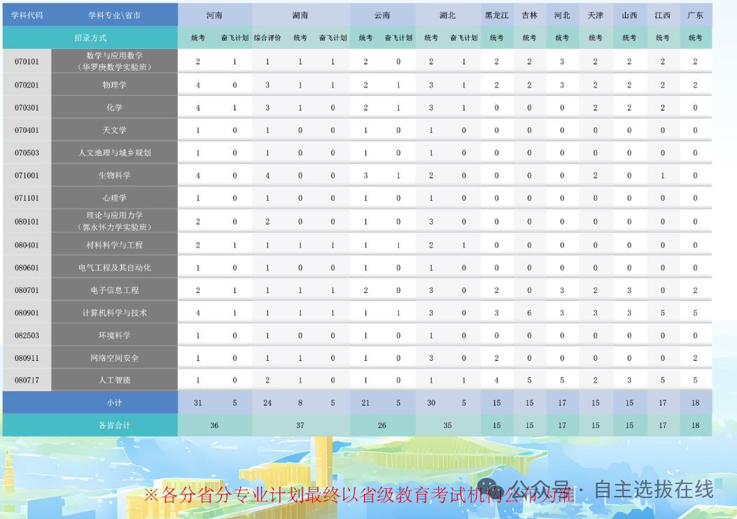 包含数学与应用数学、生物科学、电子信息工程、物理学、心理学、计算机科学与技术、化学、理论与应用力学、网络空间安全、天文学、材料科学与工程环境科学、人文地理与城乡规划、电气工程及其自动化、人工智能共15个专业。