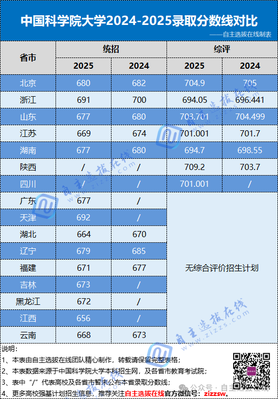 自主选拔在线团队整理了国科大2024-2025年高考统招及综合评价录取分数线对比,仅供参考: