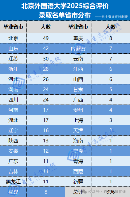 北京外国语大学2025年综合评价共录取396人,其中北京考生录取人数最多,共51人;其次则是山东,被北外录取42人;江苏、浙江、河北、湖南、四川紧随其后,录取人数在20-30左右。