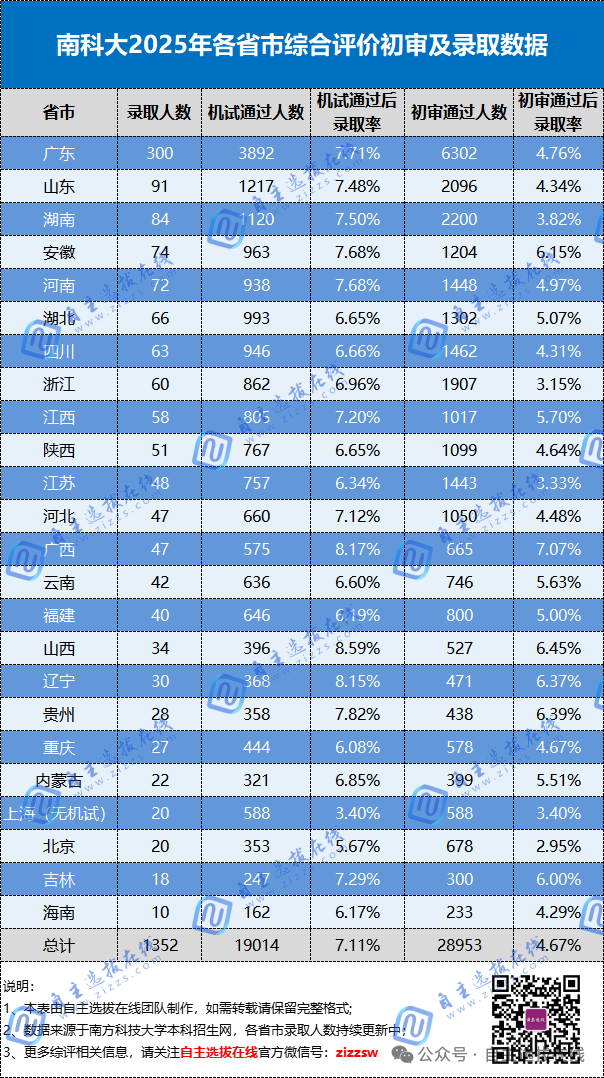 2️⃣南科大2025年综合评价共录取1352人,较2024年增加了2人;今年,南科大在各省市均有一定扩招,给了更多考生录取机会。山东、河北、广西等省市均扩招了2人。另外,安徽、湖北、浙江等省市招生人数未有变化。广东省录取人数最多有300人,但较2024年减少了23人。