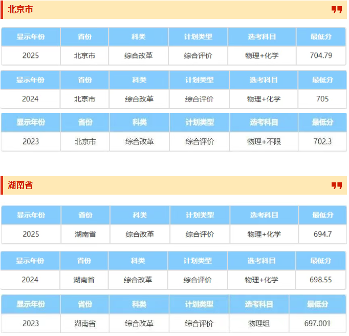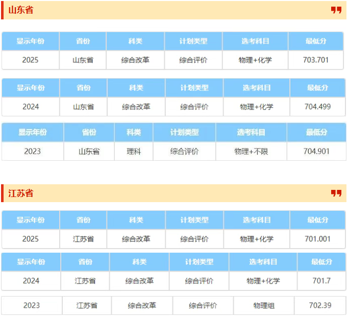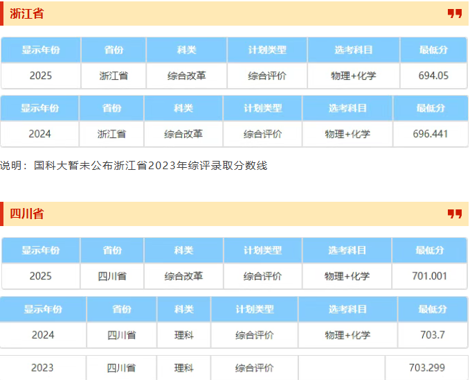 *注:以下表格内除安徽省是上科大2025年本科批录取线,其余各省均为综合评价录取分数线。