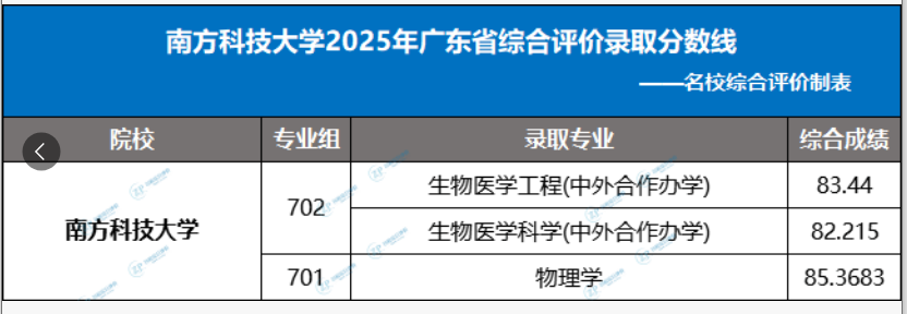 南方科技大学按照大类招生,普通专业录取分数线为85.3683;中外合办专业录取分数线为82.215。