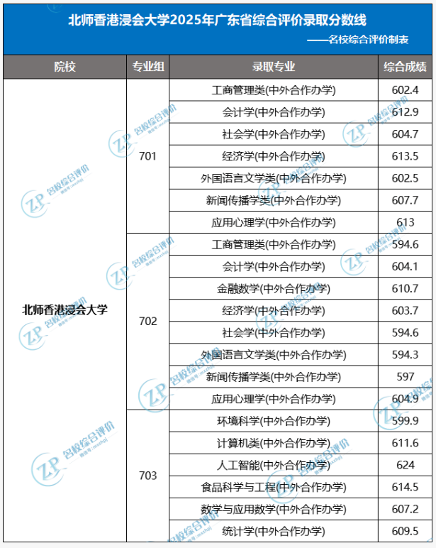 北师港浸大综评录取分数线最高的专业(组)为703(物理+化学)专业组的人工智能(624分);分数线最低的专业(组)为702(物理+不限)专业组的外国语言文学类(594.3分),701(历史+不限)专业组录取分数线为工商管理类的602.4分。