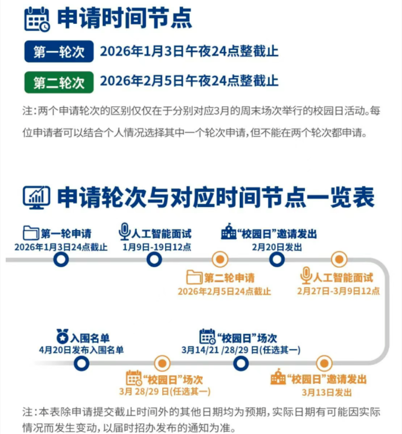 申请流程:线上报名—人工智能面试—校园日活动—入围名单—高考及志愿填报—提前批录取